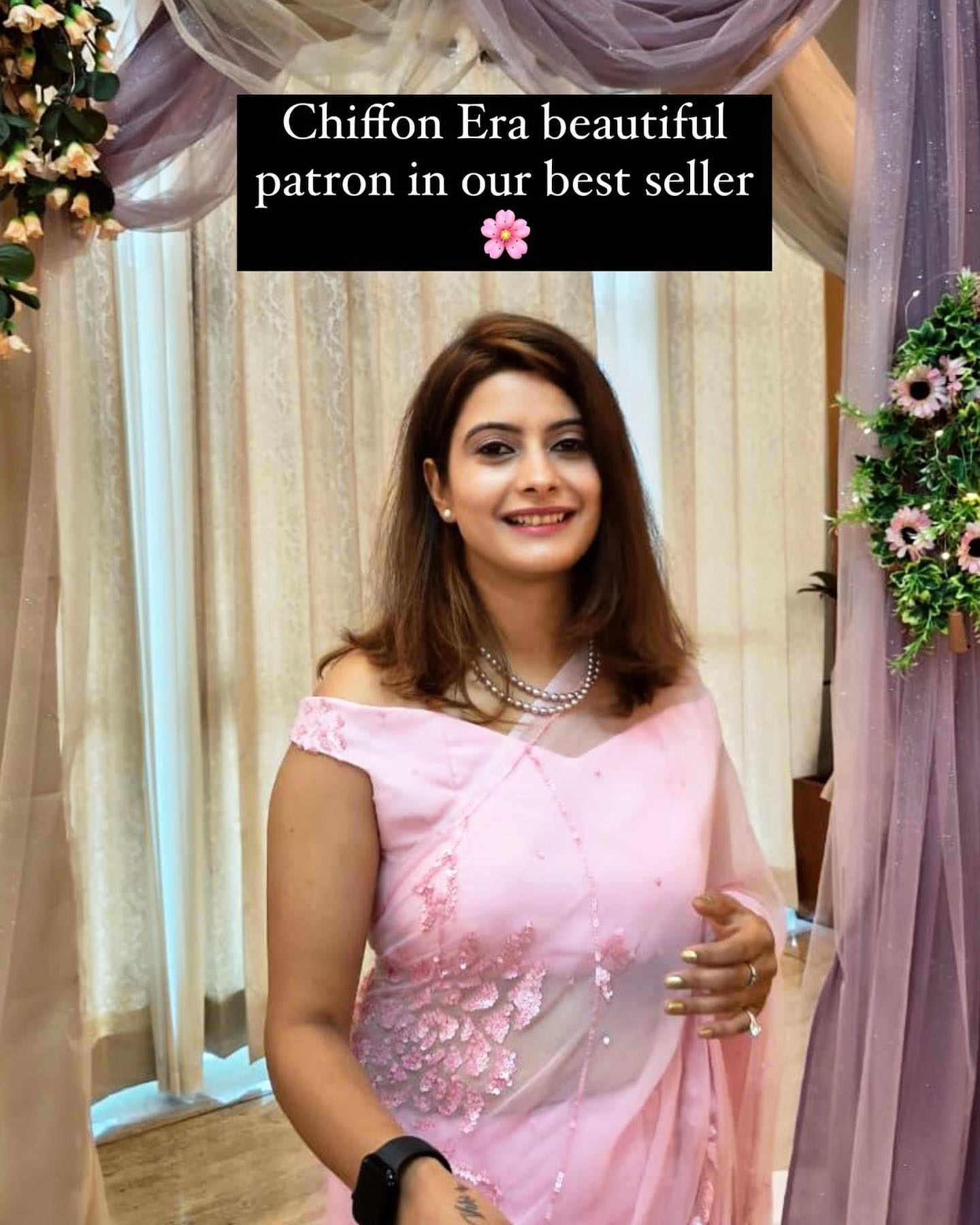 Pink Pure Chiffon Handcrafted Sequins Floral Bunch Saree with Crepe blouse